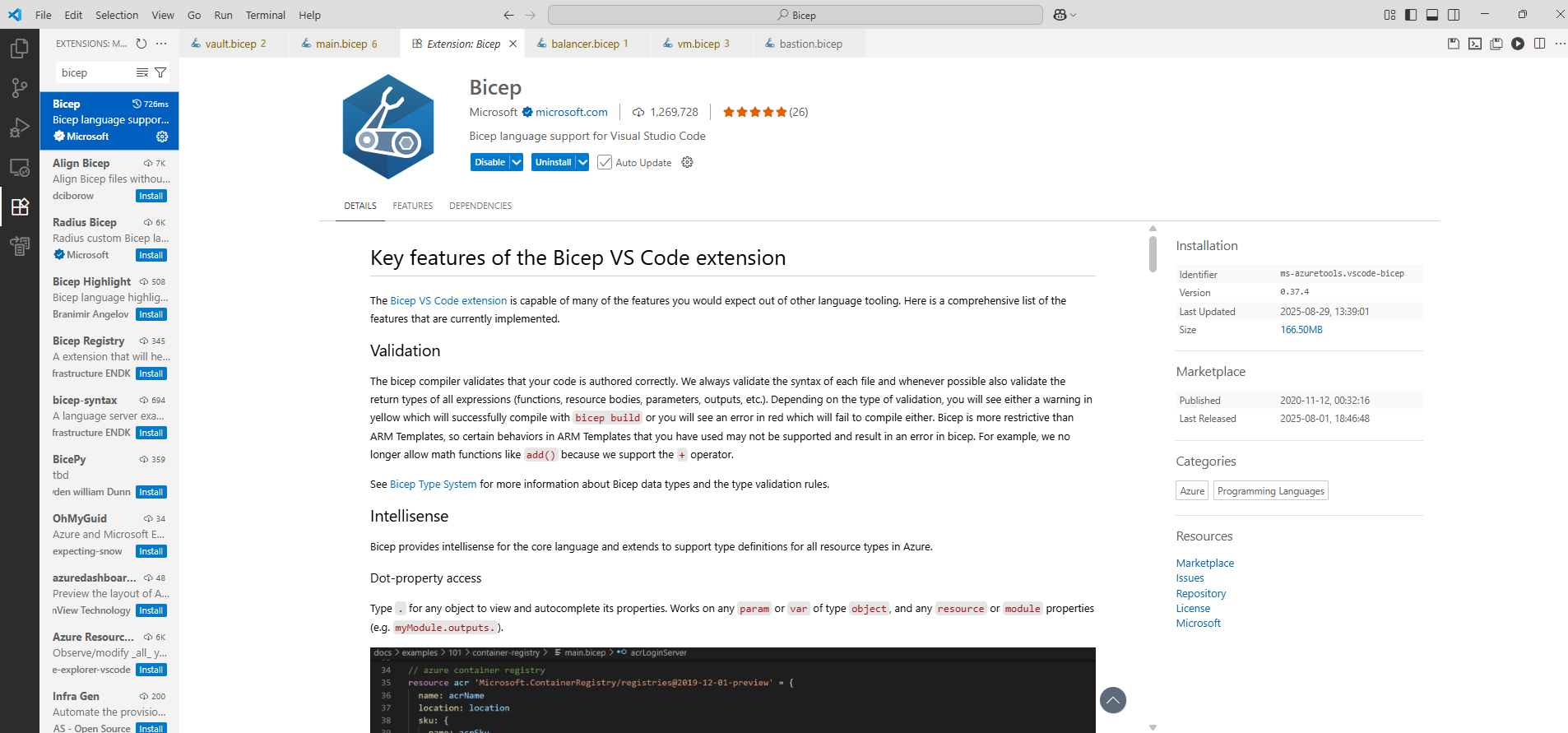 Improved Safety: The Bicep VS Code extension provides a rich authoring experience with IntelliSense, syntax highlighting, and real-time validation. This allows you to catch errors and typos before you even run the deployment.