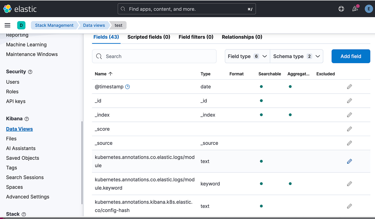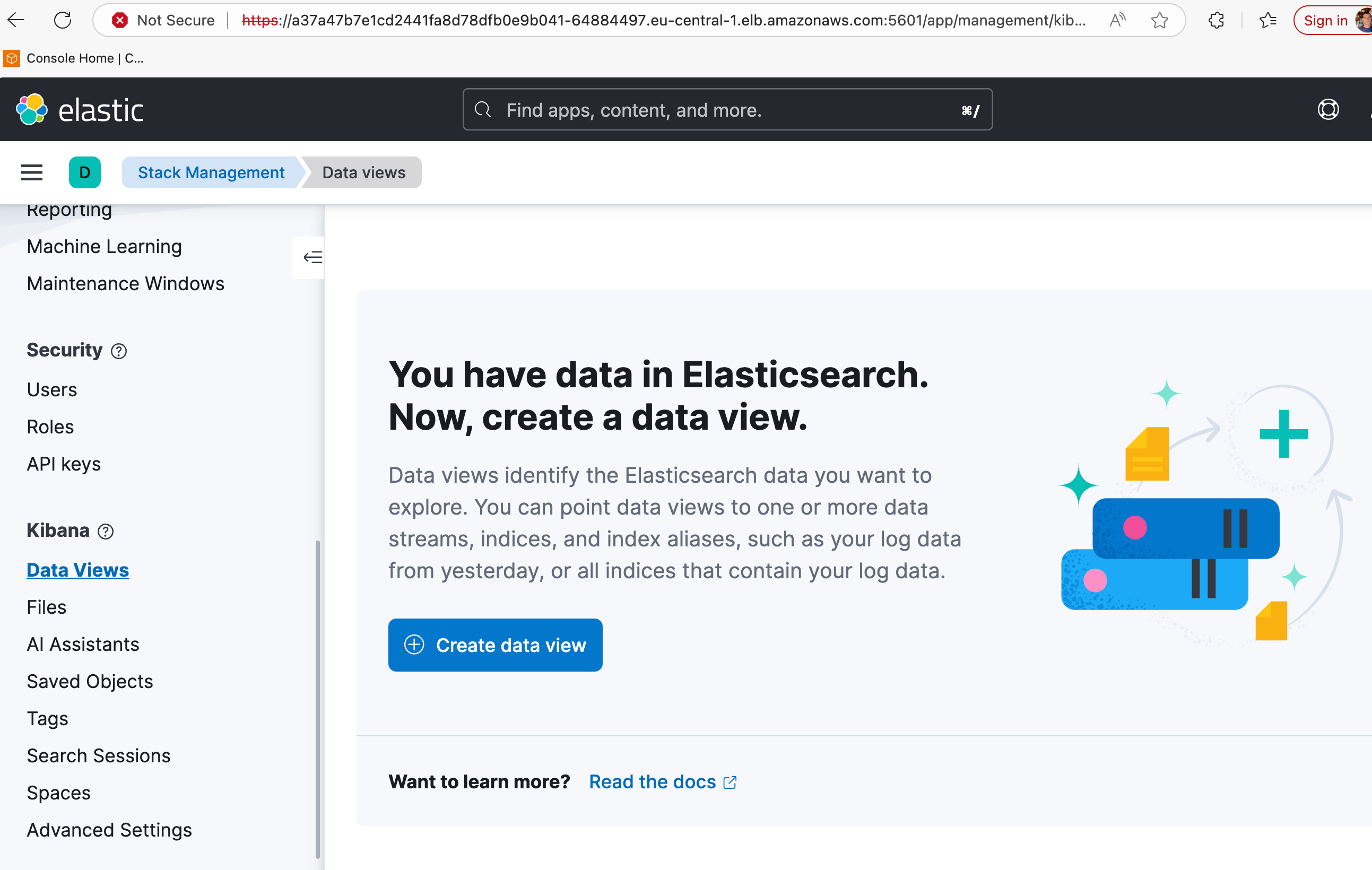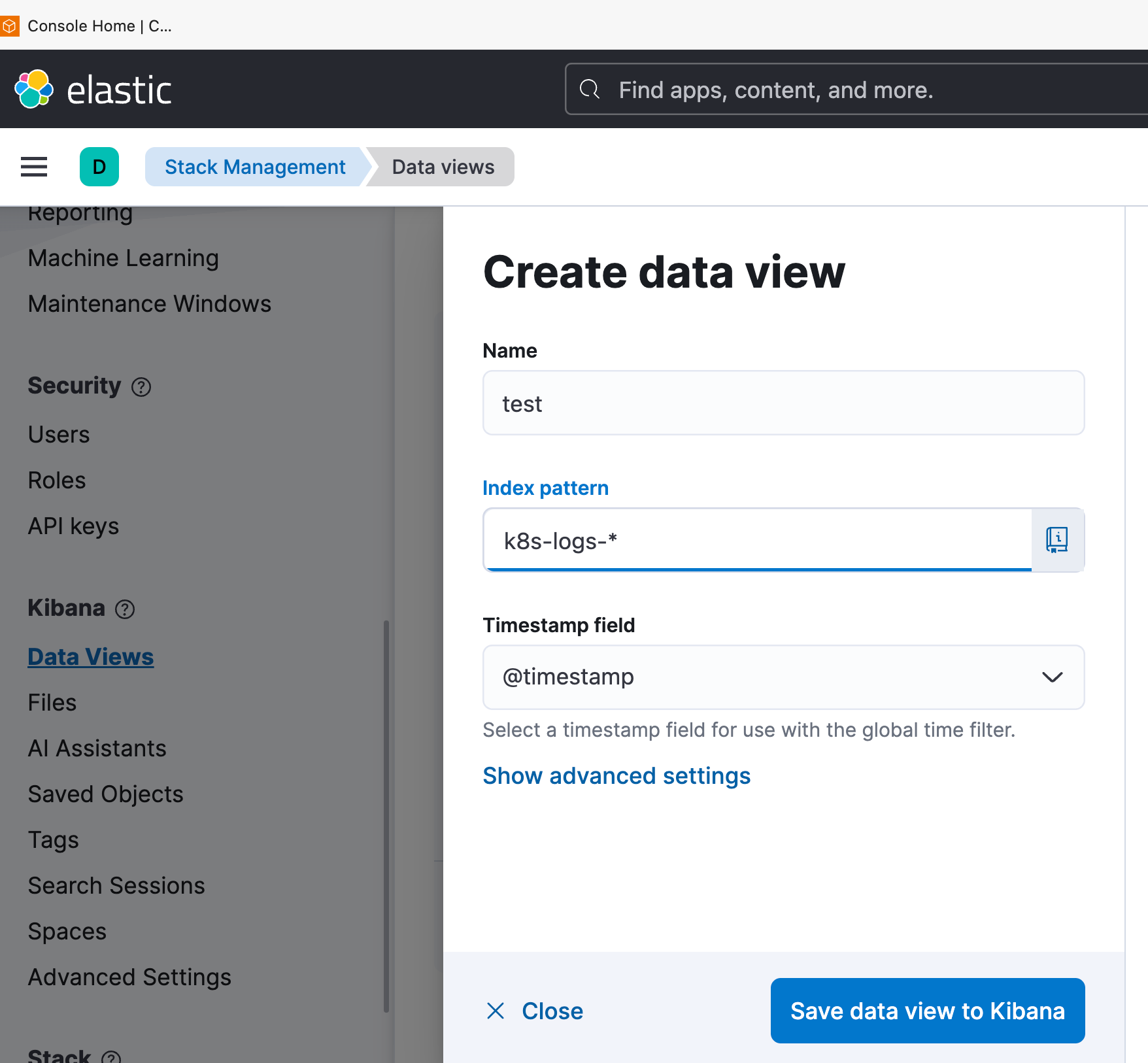 secretName: kibana-custom-cert # Use your created secretIn Kibana Dashboard-Kibana-Data views-Create Data view
